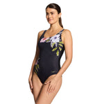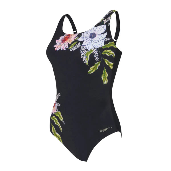 The Zoggs Freesia Adjustable Scoopback is designed to flatter and support! This swimsuit features a delicate floral placement print on a black base. With adjustable straps, full foam cups and power mesh tummy control, this one piece is perfect for those looking for quality, fit and support.