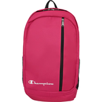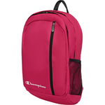 Vertical front zip pocket opening detail Dual main body zip openings into two separate compartments Side mesh drink bottle holders Padded back piece Champion script print on front pocket Colour-...