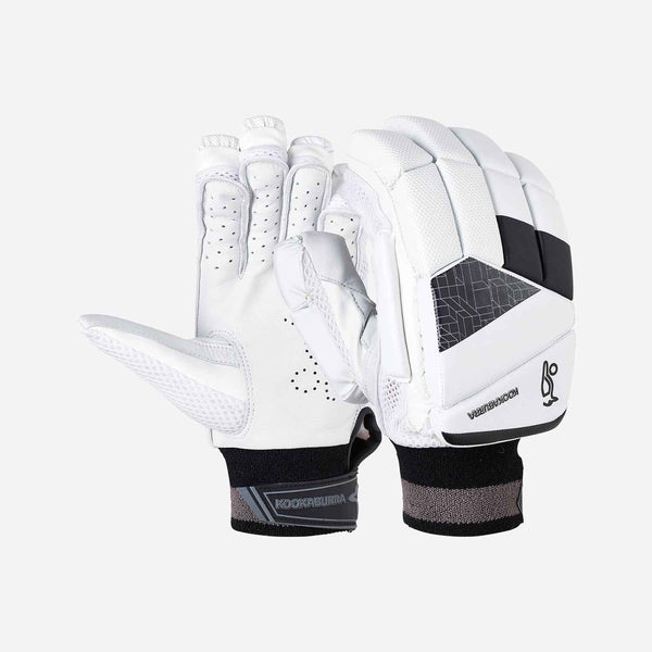 Kookaburra Shadow Pro 4.0 Batting Gloves. Adult RH. Calf leather palm HDF fingers and backhand Ergonomic square foam styling One piece side bar on bottom hand Towelling wristband