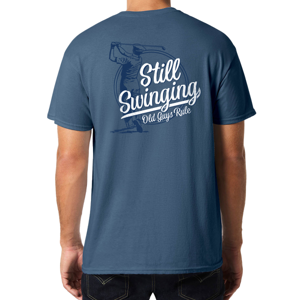 Old Guys Rule. Still Swinging. T-Shirt. indigo blue Old Guys Rule. Still Swinging. T-Shirt. indigo blue Officially licensed Old Guys Rule, printed in Australia,  Still Swinging! (at my age!!)  For...