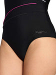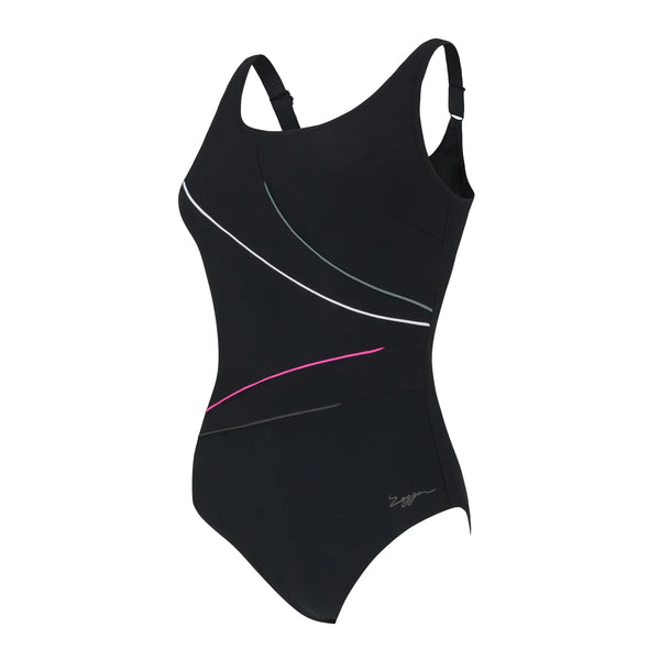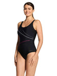 One of Zoggs first swimsuits, this is a classic style! The Black Macmaster Scoopback is designed to flatter with colourful asymmetric piping, and provides superior support with power mesh tummy control.