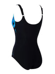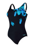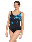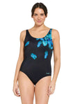 The Zoggs Mystic Adjustable Scoopback is designed to flatter and support! This swimsuit features a delicate blue leaf placement print on a black base. With adjustable straps, full foam cups and power mesh tummy control, this one piece is perfect for those looking for quality, fit and support.